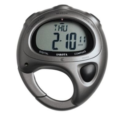 Dakota Digital Compass Watch Hook this handy carabiner to your belt loop and you're ready for your next hike, ride or outing. Features six modes: electronic compass, clock, calendar, chronograph, stopwatch and alarm. Integrated carabiner. Moon-glow dial light for nighttime viewing. Battery included.Imported.Dakota Digital Compass Watch2 1/2 "W x 3"H. 1.9 oz.